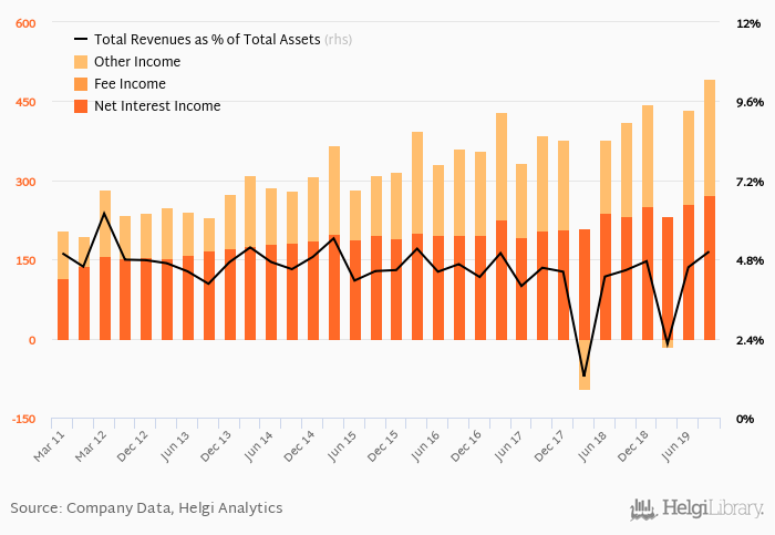 Bank's total revenues accounted for 5.04% total assets in the third quarter of 2019, up from 4.47% a year earlier.
