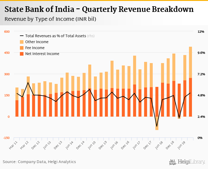 State Bank of India generated total banking revenues of INR 492 bil in the third quarter of 2019, up 20% when compared to the same period of last year and 13.6% when compared to the previous quarter.
