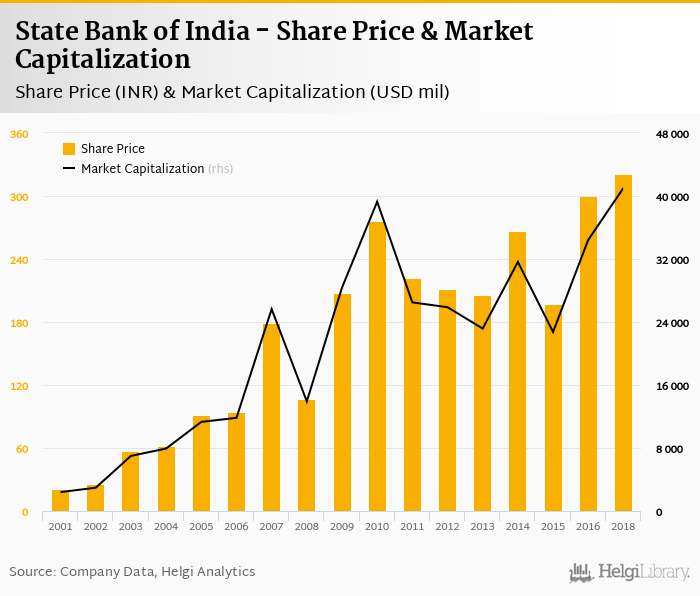 State Bank of India stock traded at INR 321 per share at the end of 2018 implying a market capitalization of USD 41,016 mil.