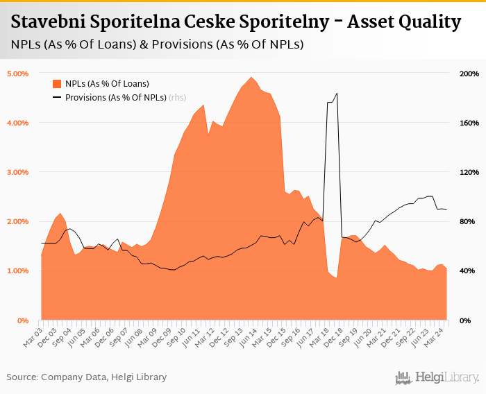 Stavebni Sporitelna Ceske Sporitelny's non-performing loans reached 1.03% of total loans at the end of 2024-06-30, up from 0.995% compared to the previous year. Historically, the NPL ratio hit an all time high of 4.91% in 2014-03-31 and an all time low of 0.834% in 2018-09-30.