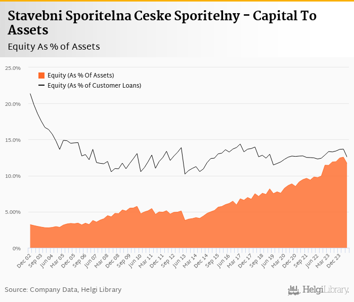 Stavebni Sporitelna Ceske Sporitelny's Equity reached 11.7% of total assets in the 2Q2024, down from 11.9% for the previous year. As a share of net customer loans, the ratio amounted to 12.6% at the end of the second quarter of 2024.
