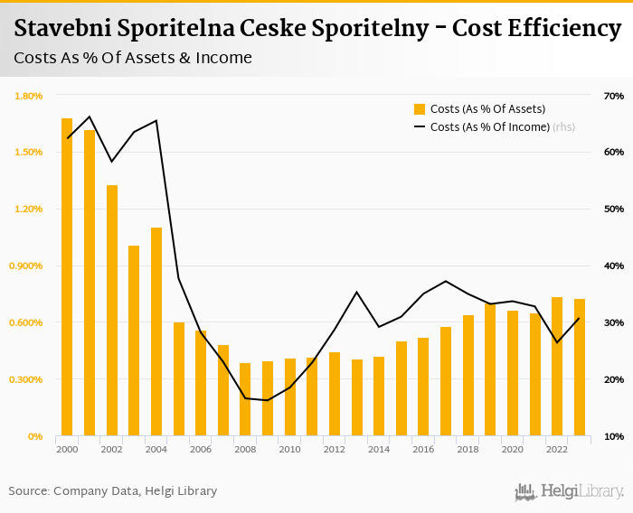 Comparing Stavebni Sporitelna Ceske Sporitelny with its closest peers, CSOB Stavebni Sporitelna operated in 2023 with a cost to income ratio of 51.2% in 2023, Raiffeisen Stavebni Sporitelna reached 51.0% and Modra Pyramida Stavebni Sporitelna some 70.4%.