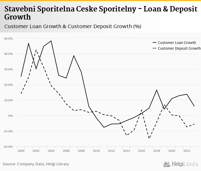 Stavebni Sporitelna Ceske Sporitelny's customer loan growth reached 5.90% in 2023, down from 13.7% compared to the previous year. Historically, the bank’s loans growth reached an all time high of 48.2% in 2004 and an all time low of -7.72% in 2011. In the last decade, the average annual loan growth amounted to 6.32%.