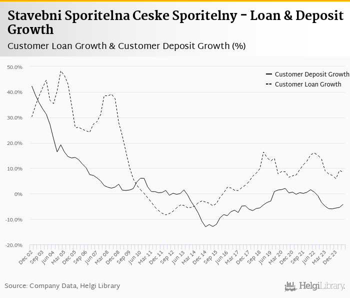 Stavebni Sporitelna Ceske Sporitelny's customer loan growth reached 8.39% in 2024-06-30, up from 7.77% compared to the previous year. Historically, the bank’s loans growth reached an all time high of 48.2% in 2004-12-31 and an all time low of -8.35% in 2012-03-31. In the last decade, the average annual loan growth amounted to 6.97%.