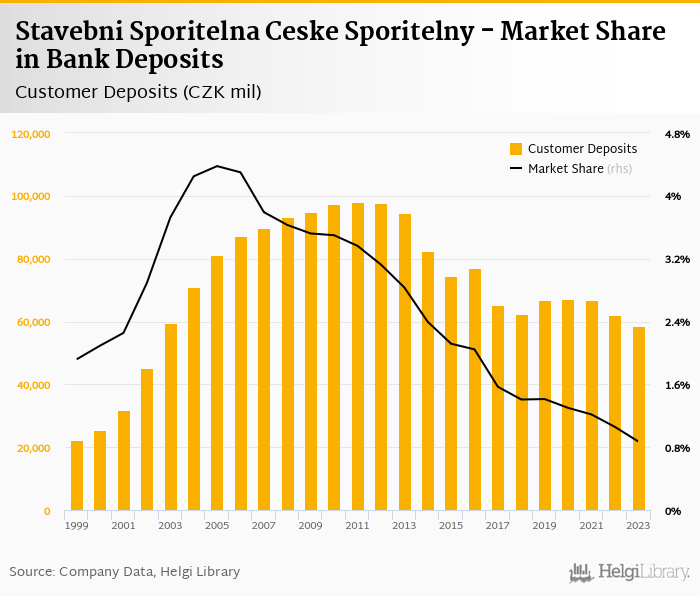 Stavebni Sporitelna Ceske Sporitelny's customer deposits reached CZK 58,474 mil in 2023, down 5.66% compared to the previous year.