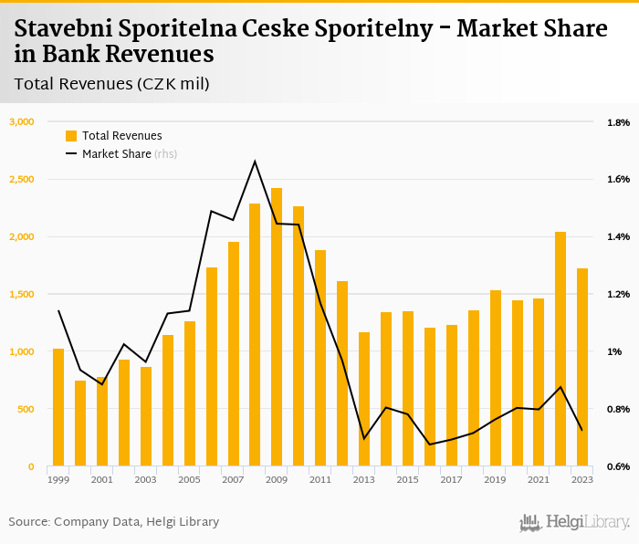 As a result, Stavebni Sporitelna Ceske Sporitelny accounted for 0.721% of all bank revenues generated by banks in Czechia in 2023. Historically, the bank’s market share in total revenues reached an all time high of 1.66% in 2008 and an all time low of 0.673% in 2016.