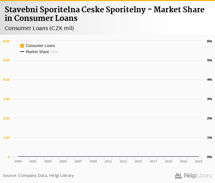 Stavebni Sporitelna Ceske Sporitelny accounted for 0% of all consumer loans issued in Czechia at the end of 2023. Historically, the bank’s market share in consumer loans reached an all time high of 0% in 2023 and an all time low of 0% in 1999.