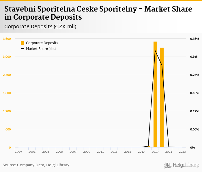 Stavebni Sporitelna Ceske Sporitelny accounted for 0% of all corporate deposits taken by banks in Czechia at the end of 2023. Historically, the bank’s market share in corporate deposits reached an all time high of 0.320% in 2019 and an all time low of 0% in 1999.