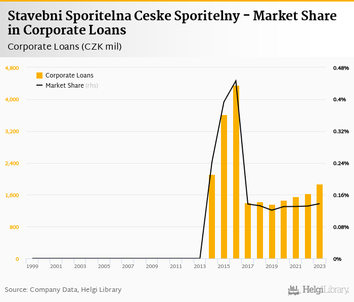 Stavebni Sporitelna Ceske Sporitelny accounted for 0.138% of all corporate loans issued in Czechia at the end of 2023. Historically, the bank’s market share in corporate loans reached an all time high of 0.446% in 2016 and an all time low of 0% in 1999.