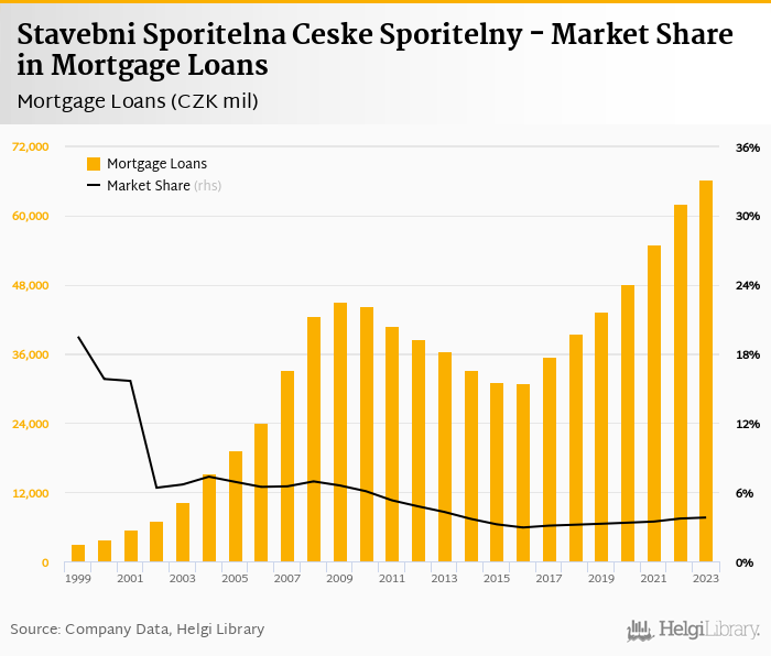Stavebni Sporitelna Ceske Sporitelny accounted for 3.80% of all mortgage loans issued in Czechia at the end of 2023. Historically, the bank’s market share in mortgage loans reached an all time high of 19.5% in 1999 and an all time low of 2.94% in 2016.