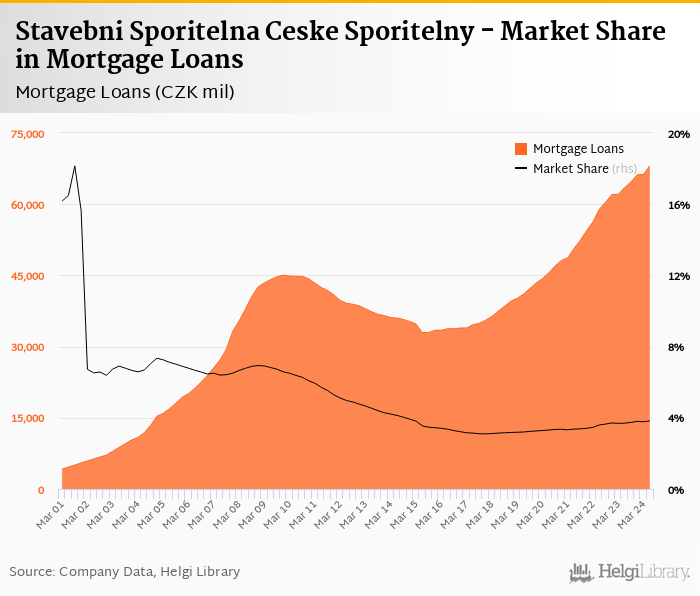 Stavebni Sporitelna Ceske Sporitelny accounted for 3.83% of all mortgage loans issued in Czechia at the end of 2Q2024. Historically, the bank’s market share in mortgage loans reached an all time high of 18.2% in 3Q2001 and an all time low of 3.10% in 4Q2017.