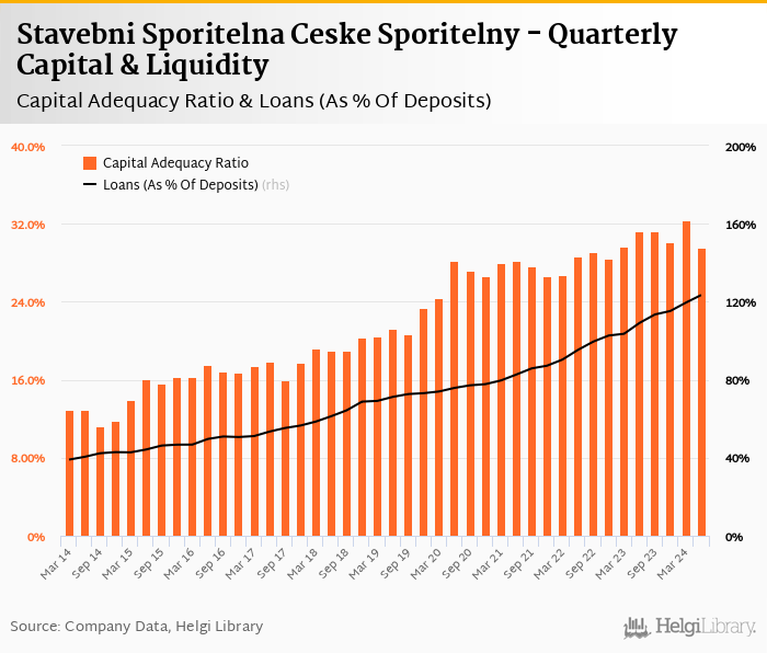 When compared to bank's main peers, CSOB Stavebni Sporitelna ended the second quarter of 2024 with a capital adequacy ratio at 28.1% and loans to deposits of 109%, Raiffeisen Stavebni Sporitelna with 24.4% and 118% respectively and Modra Pyramida Stavebni Sporitelna some 38.1% in terms of capital adequacy and 189% of loans to deposits at the end of the second quarter of 2024.