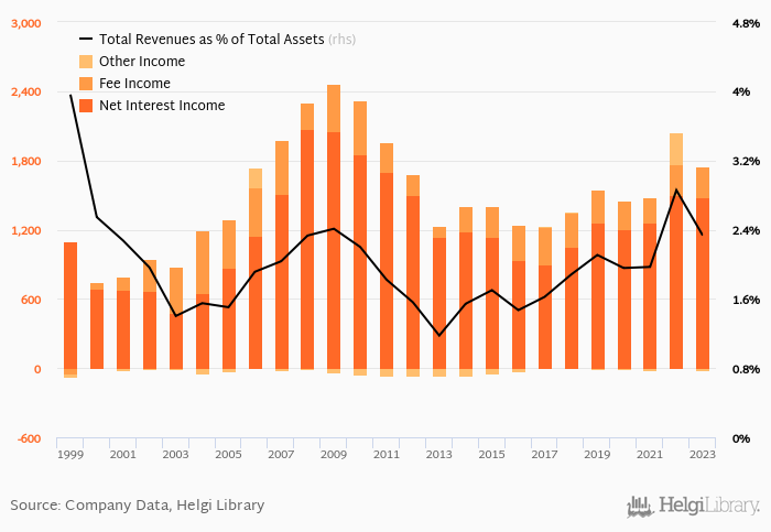 Bank's total revenues accounted for 2.33% total assets in 2023, down from 2.86% a year earlier.