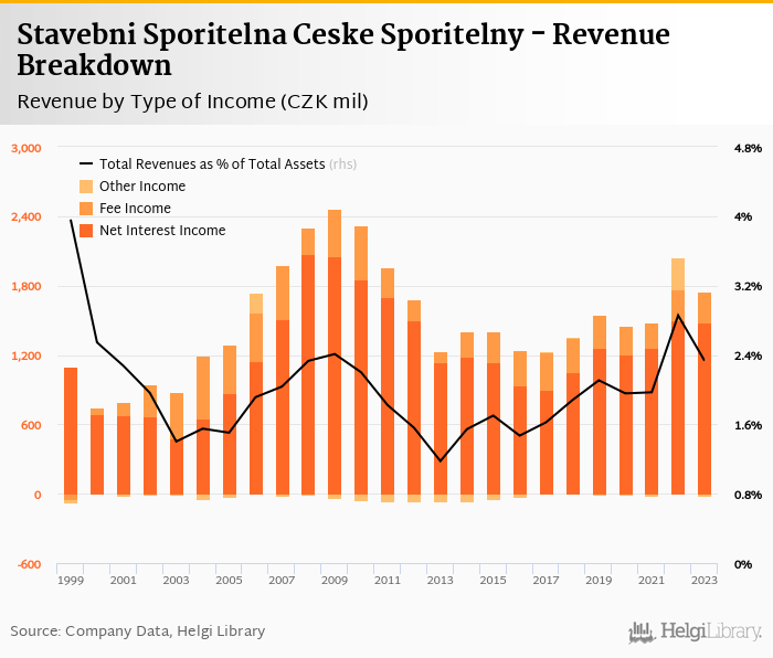 Comparing Stavebni Sporitelna Ceske Sporitelny with its closest peers, CSOB Stavebni Sporitelna generated total revenues of 1.82% of assets in 2023, Raiffeisen Stavebni Sporitelna operated with 1.55% revenue margin and Modra Pyramida Stavebni Sporitelna produced total income worth 1.26% of assets.