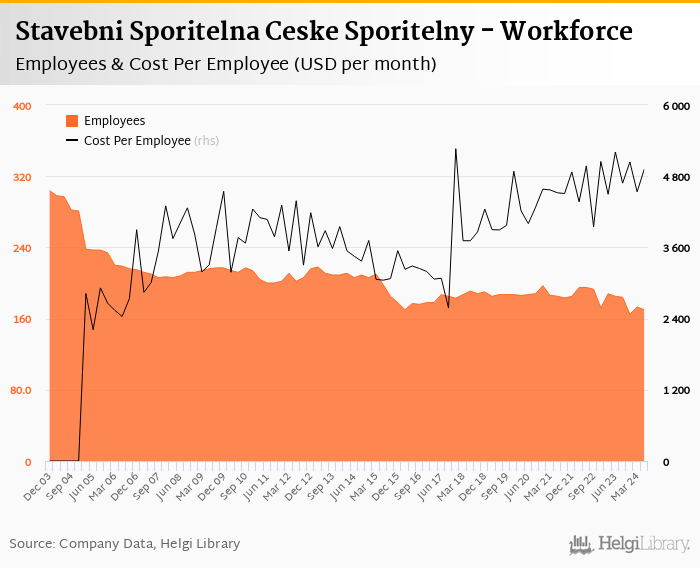 Stavebni Sporitelna Ceske Sporitelny employed 170 persons in 2024-06-30, down 1.73% when compared to the previous year. Historically, the bank's workforce hit an all time high of 304 persons in 2003-12-31 and an all time low of 165 in 2023-12-31.