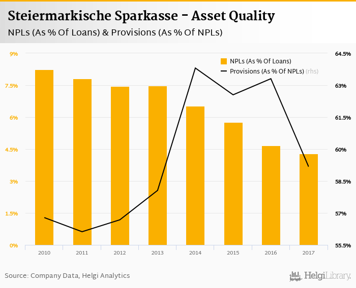 Steiermarkische Sparkasse's non-performing loans reached 4.29% of total loans at the end of 2017, down from 4.67% compared to the previous year. Historically, the NPL ratio hit an all time high of 8.24% in 2010 and an all time low of 4.29% in 2017.