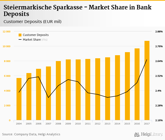 Steiermarkische Sparkasse accounted for 2.65% of all customer deposits taken by banks in Austria at the end of 2017. Historically, the bank’s market share in customer deposits reached an all time high of 2.65% in 2017 and an all time low of 2.34% in 2007.