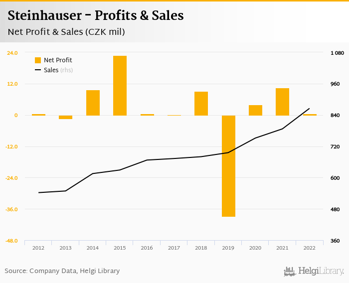 Steinhauser made a net profit of CZK 0.481 mil in 2022, down 95.4% compared to the previous year. Total sales reached CZK 865 mil, which is up 10% when compared to the previous year.