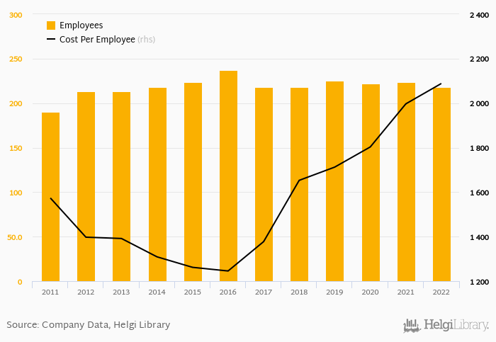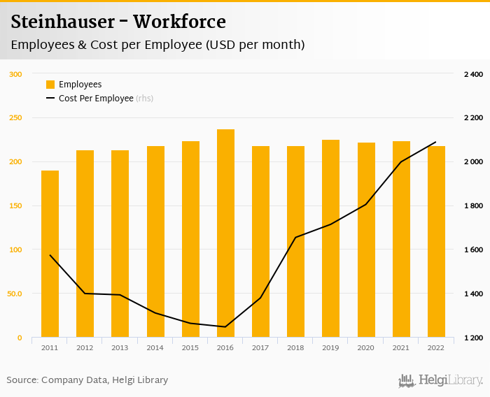 Steinhauser employed 218 employees in 2022, down 2.68% compared to the previous year. Historically, between 2011 and 2022, the firm's workforce hit a high of 237 employees in 2016 and a low of 190 employees in 2011.