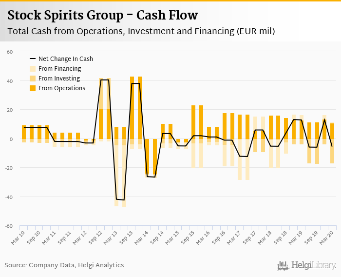 Stock Spirits Group's operating cash flow stood at EUR 10.4 mil in 1Q2020, down 16.7% when compared to the previous year. Historically, between 1Q2010 - 1Q2020, the firm’s operating cash flow reached a high of EUR 42.7 mil in 4Q2013 and a low of EUR -24.2 mil in 2Q2014.