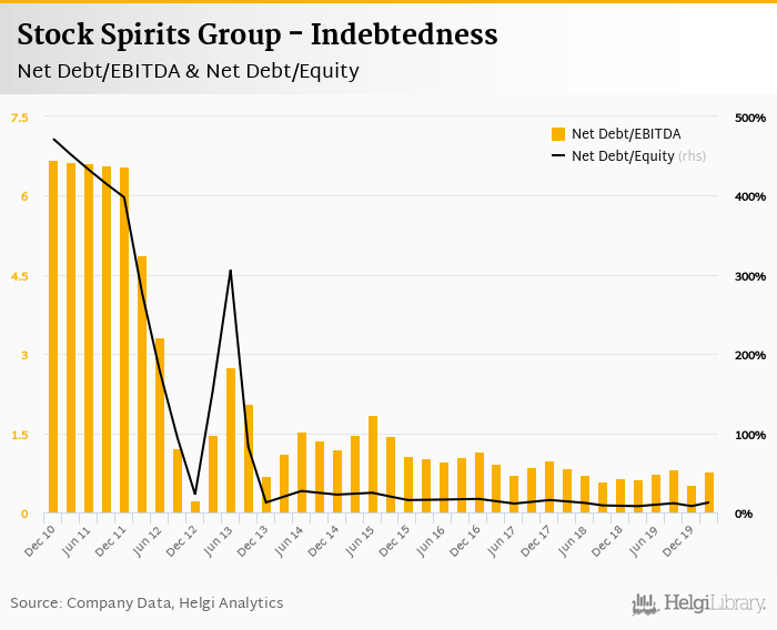 Stock Spirits Group's net debt stood at EUR 44.9 mil and accounted for 12.7% of equity at the end of 1Q2020. The ratio is up 4.74 pp compared to the previous year.