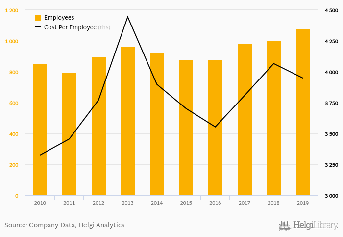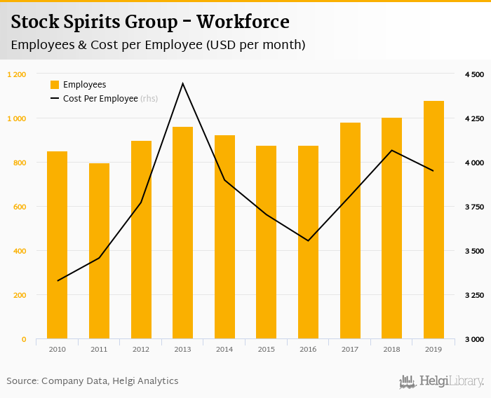 Stock Spirits Group employed 1,080 employees in 2019, up 7.68% compared to the previous year. Historically, between 2010 and 2019, the firm's workforce hit a high of 1,080 employees in 2019 and a low of 796 employees in 2011.