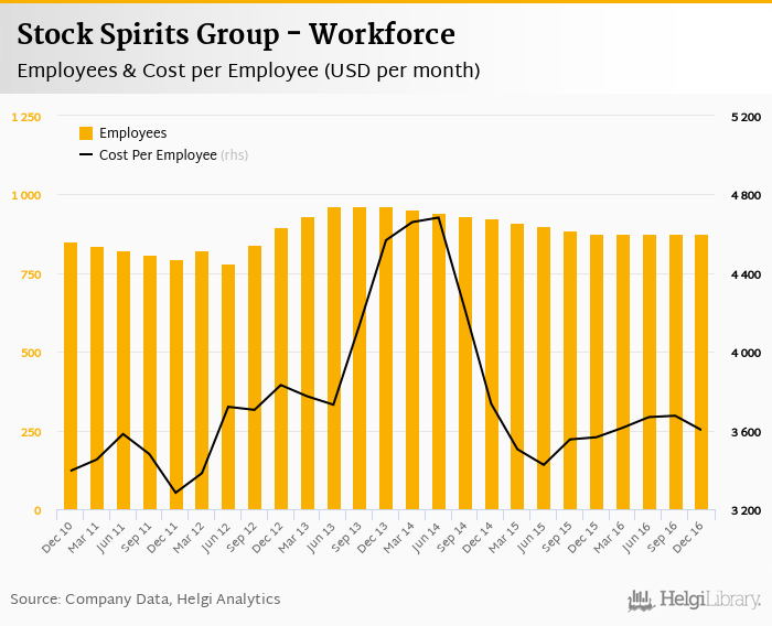 Stock Spirits Group employed 876 employees in 4Q2016, up 0.114% compared to the previous year. Historically, between 4Q2010 and 4Q2016, the firm's workforce hit a high of 962 employees in 4Q2013 and a low of 782 employees in 2Q2012.
