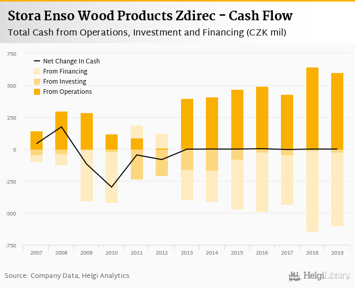 Stora Enso Wood Products Zdirec's operating cash flow stood at CZK 601 mil in 2019, down 6.42% when compared to the previous year. Historically, between 2007 - 2019, the firm’s operating cash flow reached a high of CZK 642 mil in 2018 and a low of CZK 8.71 mil in 2012.