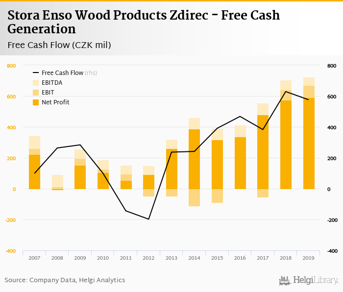 Stora Enso Wood Products Zdirec made a net profit of CZK 590 mil with revenues of CZK 4,333 mil in 2019, up by 2.42% and down by 10.6%, respectively, compared to the previous year. This translates into a net margin of 13.6%.