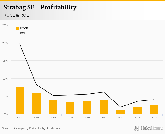 As far as Strabag SE's peers are concerned, Wienerberger generated ROE of -12.3% and ROCE of -8.21% in 2014. PORR Group's profitability reached 11.3% and 3.99%, respectively.