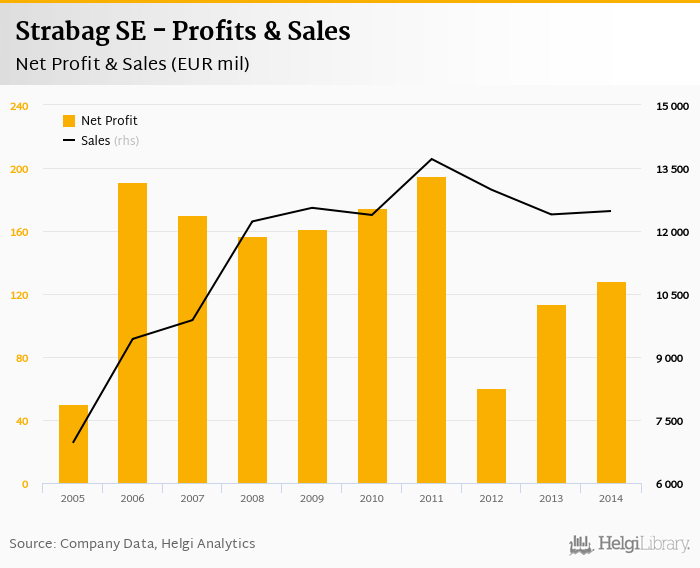 Strabag SE made a net profit of EUR 128 mil in 2014, up 12.7% compared to the previous year. Total sales reached EUR 12,476 mil, which is up 0.658% when compared to the previous year.