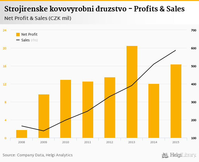 Strojirenske kovovyrobni druzstvo made a net profit of CZK 16.4 mil in 2015, up 35.5% compared to the previous year. Total sales reached CZK 587 mil, which is up 15.2% when compared to the previous year.