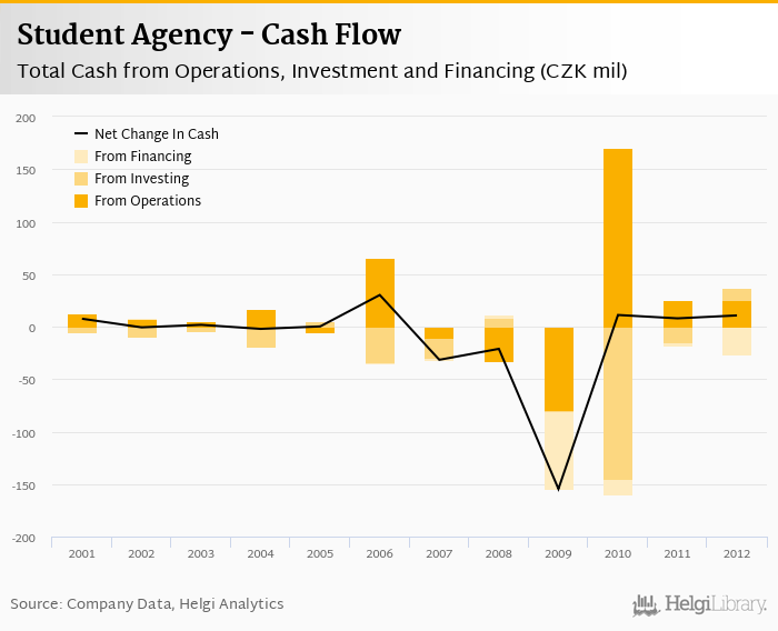 Cash from financing amounted to CZK -26.4 mil, so the company generated CZK 10.7 mil net cash in 2012.