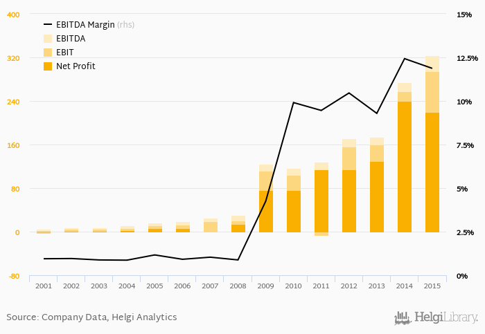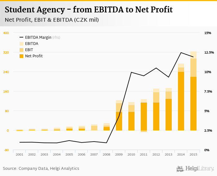 Student Agency made a net profit of CZK 220 mil with revenues of CZK 2,733 mil in 2015, down by 8.34% and up by 23.6%, respectively, compared to the previous year. This translates into a net margin of 8.04%.