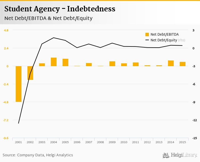 Student Agency's net debt stood at CZK 184 mil and accounted for 0.396 of equity at the end of 2015. The ratio is down 0.047 pp compared to the previous year.