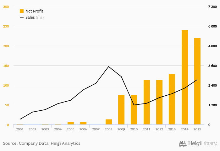 Sales have grown by 6.39% a year on average since 2005. They reached a high of CZK 3,525 mil in 2008 and a low of CZK 307 mil in 2001.