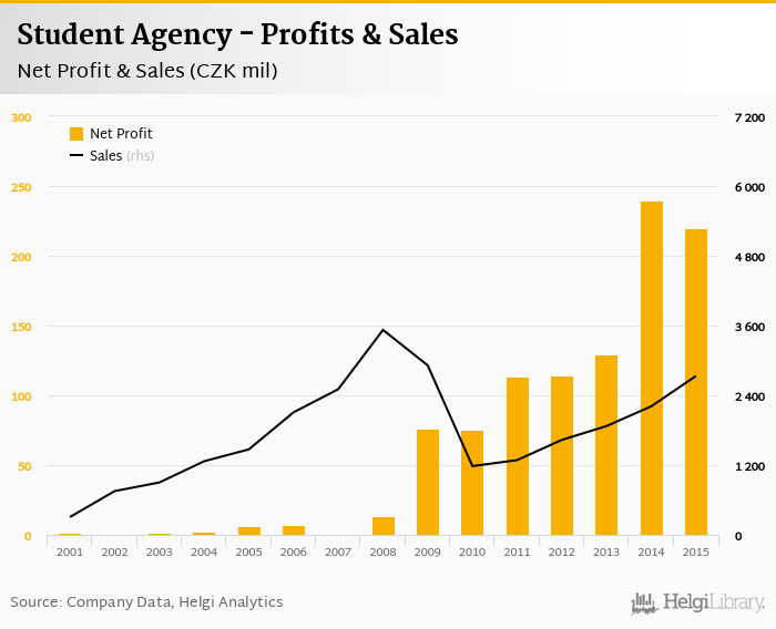 Student Agency made a net profit of CZK 220 mil in 2015, down 8.34% compared to the previous year. Total sales reached CZK 2,733 mil, which is up 23.6% when compared to the previous year.