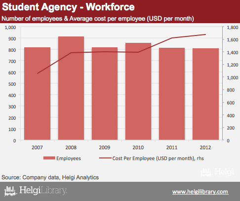 Student Agency is a Czech travel agency whose main focuses are on au-pair programmes, resale of airline tickets and bus and railway transport. In 2012, the Company (or its limited company excluding other subsidiaries) had 808 employees. The average staff cost reached USD 1,679 per employee and month