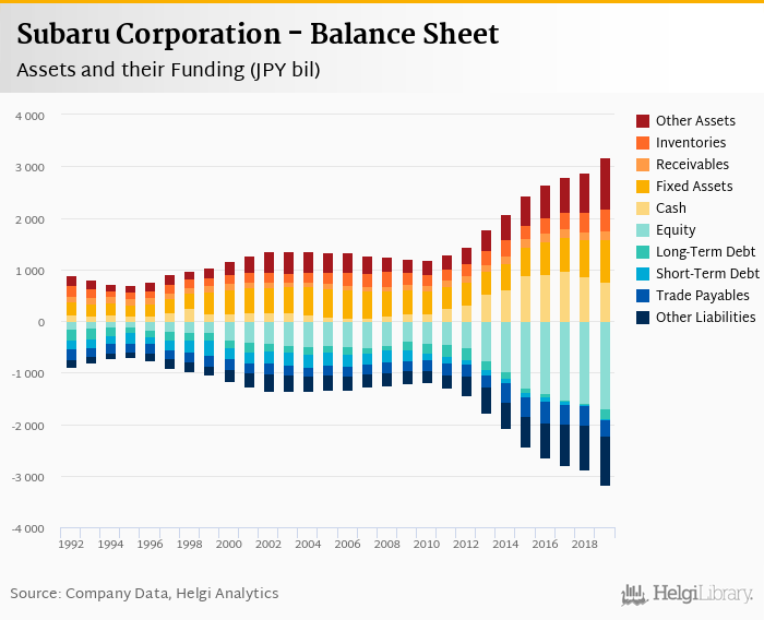 Subaru Corporation's total assets reached JPY 3,167 bil at the end of 2019, up 10.3% compared to the previous year.