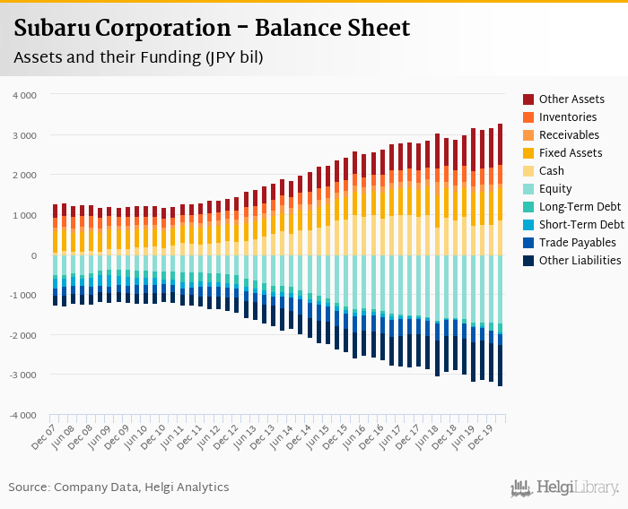 Subaru Corporation's total assets reached JPY 3,294 bil at the end of 1Q2020, up 10.4% compared to the previous year.