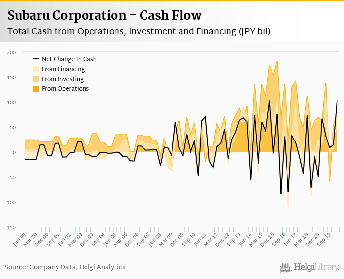Subaru Corporation's operating cash flow stood at JPY 80.9 bil in 1Q2020, up 31.2% when compared to the previous year. Historically, between 2Q1999 - 1Q2020, the firm’s operating cash flow reached a high of JPY 180 bil in 1Q2016 and a low of JPY -57.5 bil in 3Q2019.