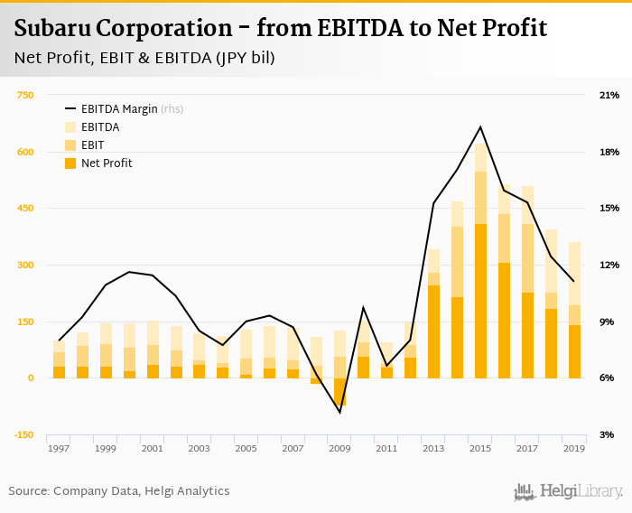 Subaru Corporation made a net profit of JPY 141 bil with revenues of JPY 3,268 bil in 2019, down by 23.9% and up by 2.55%, respectively, compared to the previous year. This translates into a net margin of 4.32%.