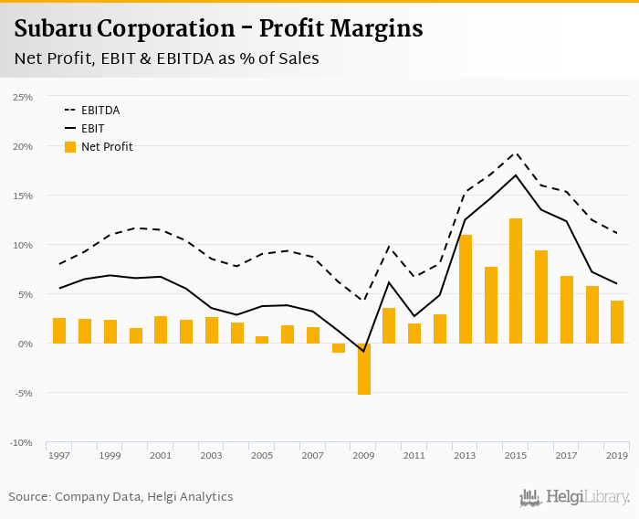 Subaru Corporation made a net profit of JPY 141 bil with revenues of JPY 3,268 bil in 2019, down by 23.9% and up by 2.55%, respectively, compared to the previous year.