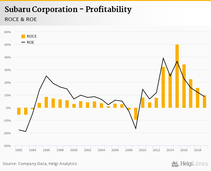 Subaru Corporation made a net profit of JPY 141 bil in 2019, down 23.9% compared to the previous year. Historically, between 1992 and 2019, the company's net profit reached a high of JPY 409 bil in 2015 and a low of JPY -70.3 bil in 2009.