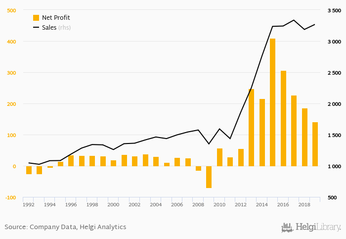 Historically, between 1992 and 2019, the company’s net profit reached a high of JPY 409 bil in 2015 and a low of JPY -70.3 bil in 2009. Over the last decade the firm's net profit increased by an average of 0% a year.