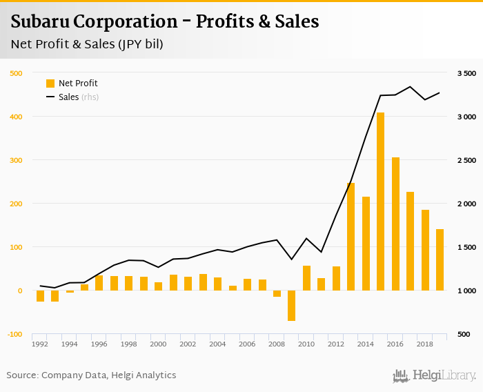 Subaru Corporation made a net profit of JPY 141 bil in 2019, down 23.9% compared to the previous year. Total sales reached JPY 3,268 bil, which is up 2.55% when compared to the previous year.