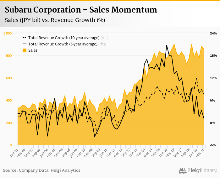 Subaru Corporation generated sales of JPY 860 bil in 1Q2020, up 9.76% compared to the previous year. Historically, between 2Q1991 and 1Q2020, the company’s sales reached a high of JPY 900 bil in 4Q2018 and a low of JPY 250 bil in 1Q1994.