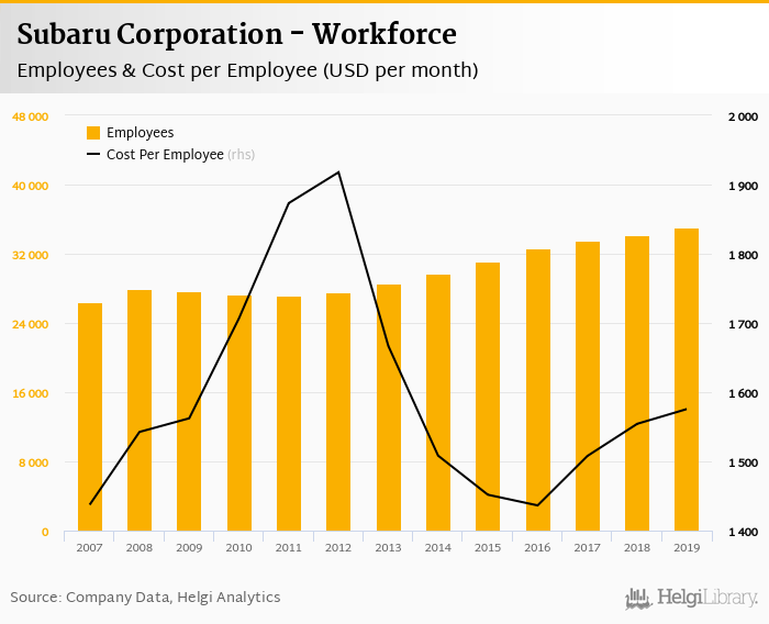 Subaru Corporation employed 35,034 employees in 2019, up 2.44% compared to the previous year. Historically, between 1999 and 2019, the firm's workforce hit a high of 35,034 employees in 2019 and a low of 25,598 employees in 2006.