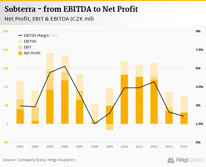 Subterra made a net profit of CZK 36.0 mil with revenues of CZK 4,251 mil in 2014, down by 11.2% and down by 0.498%, respectively, compared to the previous year. This translates into a net margin of 0.846%.