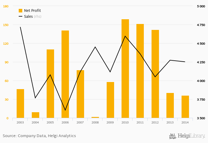 Sales have grown by 1.22% a year on average since 2004. They reached a high of CZK 4,718 mil in 2003 and a low of CZK 3,604 mil in 2006.